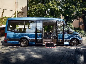Aussi flexible que vos passagers : grâce à un système de rail installé sur le plancher du véhicule, les sièges du TGE Combi peuvent1) très facilement être déplacés et repositionnés. La grande porte coulissante électrique et la marche escamotable électrique4) assurent une montée sans encombre et constituent la grande nouveauté.